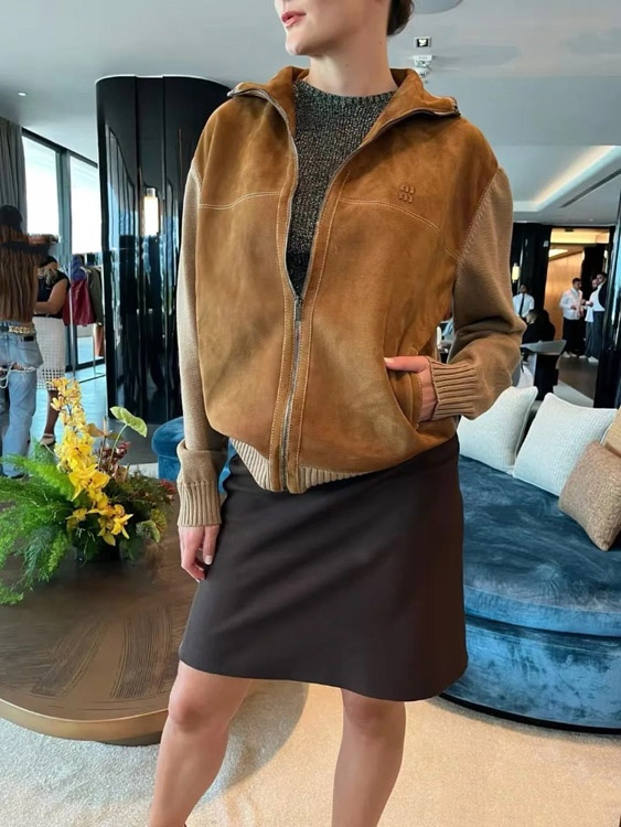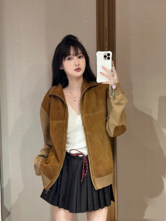 Home > Miu Miu new arrival: Knitted sleeve paneling, zip-up, stand-collar casual jacket-5370